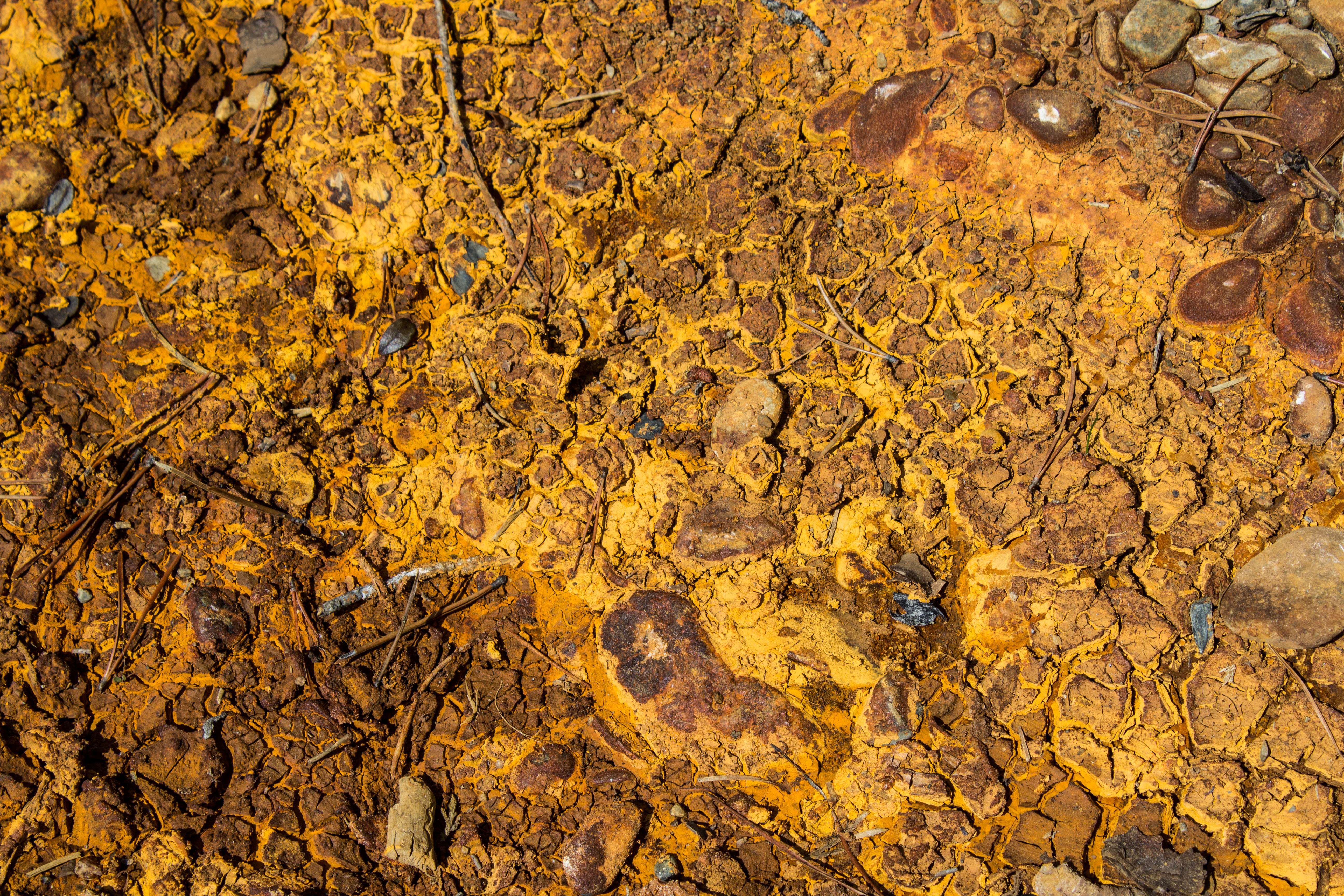 Walking in from the parking lot was easy. Stroll down the slope, cross the Vermilion River on an incredible foot bridge, catch a whiff of sulphur, head through a thicket, and find a marsh of various shades of ochre, aka the Paint Pots. The mineral springs that feed the marsh run down the hill on the far side. The ochre color varies from murky yellow to ruddy orange, depending on the amount of water and impurities.