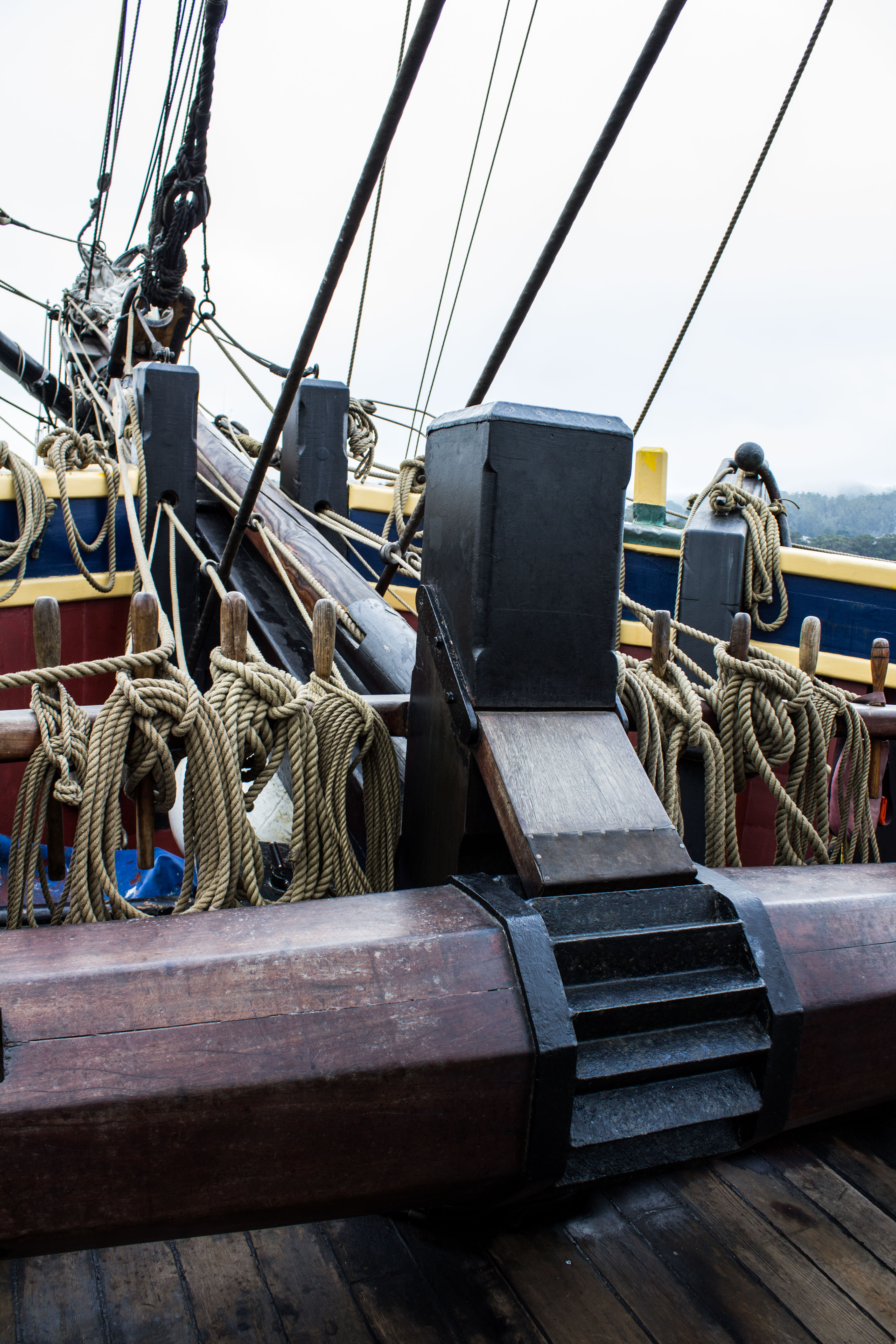 The ocean off of Half Moon Bay is a bit too rough right now for MontaraManDan and The Geek to attempt an adventure sail. Probably they are a bit too rough for us about 95 percent of the time. (The Geek counts barfing at sea as one of her super powers.) But we did climb aboard the Lady Washington dockside earlier this week during visiting hours to take a look around. The Seaport Authority suggests a $5 donation.