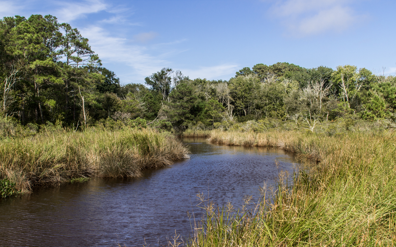 Come for the spiders but stay for the fairyland forest of stunted, moss-covered oaks, wax myrtle and holly. You’ll find two trails: A quarter-mile boardwalk from the parking lot to Currituck Sound that carries you safely across a swampy estuary, and a surface trail that branches from the boardwalk onto higher and drier ground for half a mile or so before it, too, ends at the sound.